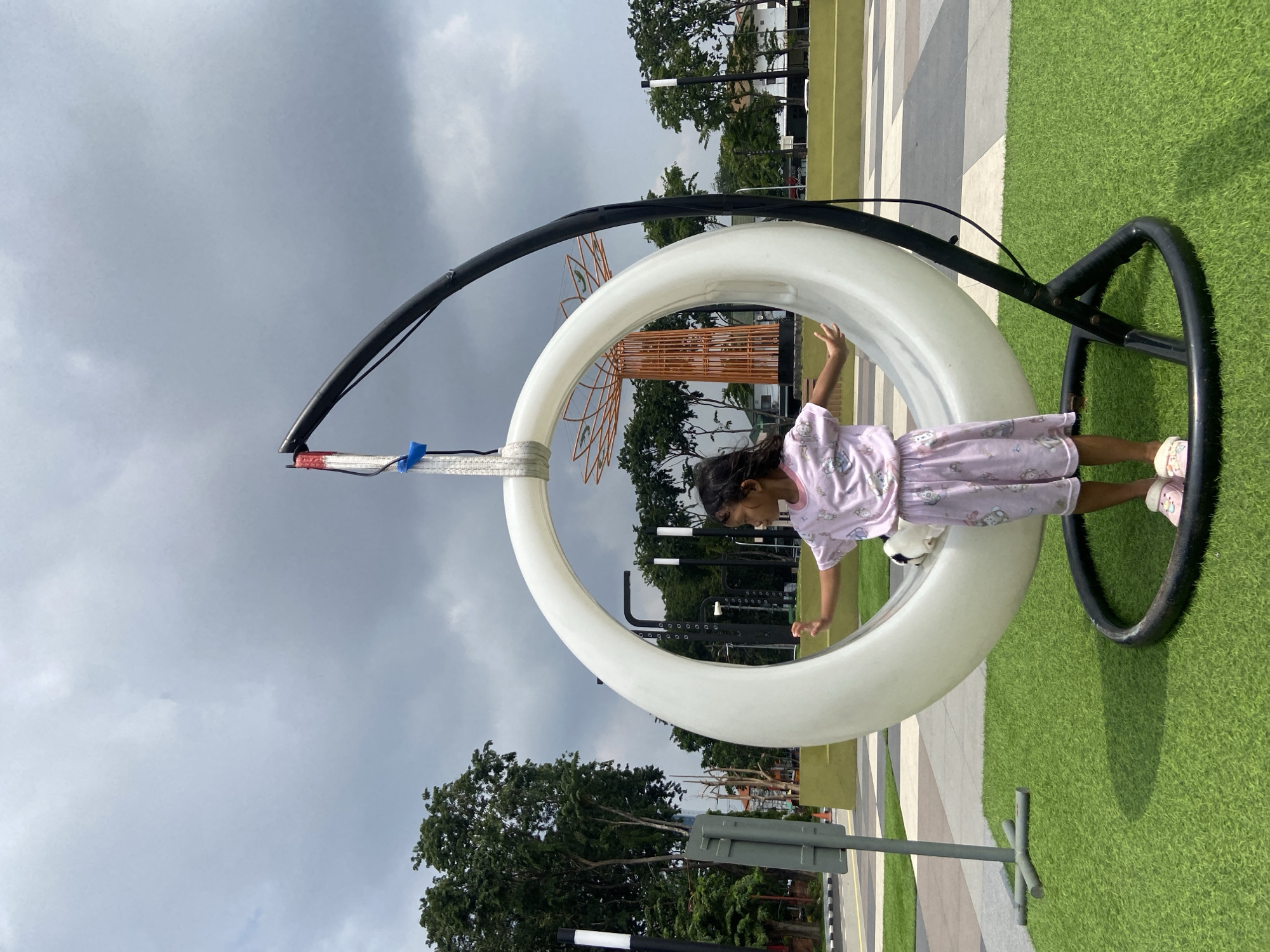 An outdoor scene in a public park in Sidoarjo, Indonesia, is depicted under an overcast sky. A young child, appearing female, with dark hair and wearing light pink patterned pajamas and pink slippers, stands facing slightly left with arms outstretched to her sides. She is positioned within a large, hollow, white circular swing suspended by a white braided rope from a black, curved metal support structure. The support frame includes a black circular base on the ground. A small white and black stuffed animal rests on the lower right curve of the white swing, behind the child. The immediate ground consists of vibrant green artificial turf, which transitions into patterned gray and white paved areas. In the mid-ground, a gray street sign on a pole is visible to the left, alongside a paved road. The background features numerous mature green trees, several black poles with white-illuminated tops, and a prominent orange, lattice-work sculptural structure resembling a tree. Distant buildings and additional foliage are visible under the cloudy sky.