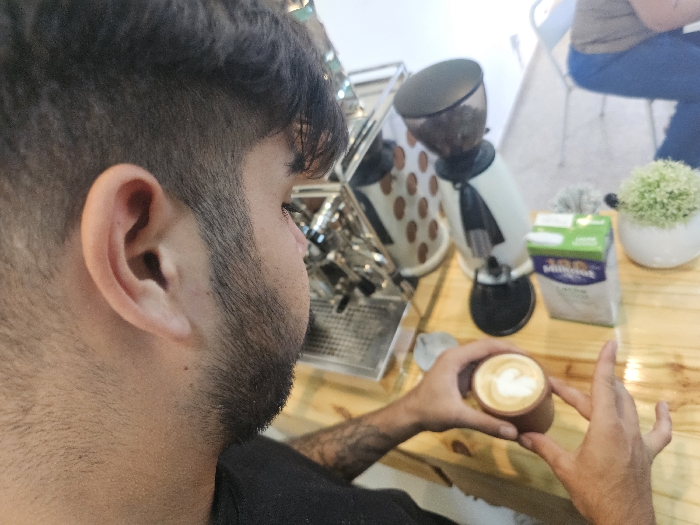 A man is seen in profile, with a focus on his ear and facial hair. In his hands, he holds a small cup of coffee with latte art. Behind him on a wooden counter is a coffee grinder, a carton of milk, and a potted green plant. In the background, a metal coffee machine and a person seated on a chair can be seen. The scene suggests the man is a barista or enjoying coffee preparation.