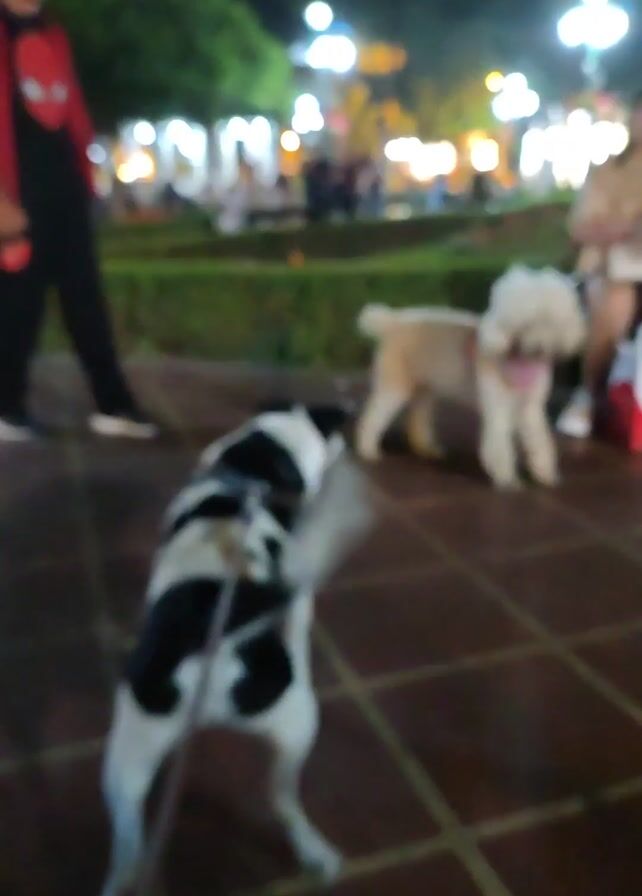 At night, in an outdoor park, a man wearing a red jacket with a Spider-Man graphic and black pants is standing on a tiled plaza area with two leashed dogs. The dog closest to the camera is a medium-sized black and white breed. A tan dog is standing nearby, its leash held by a woman sitting on a bench. Behind the woman, there are bushes and more people in the background. Lampposts are lit up around the plaza. The black and white dog wags its tail.