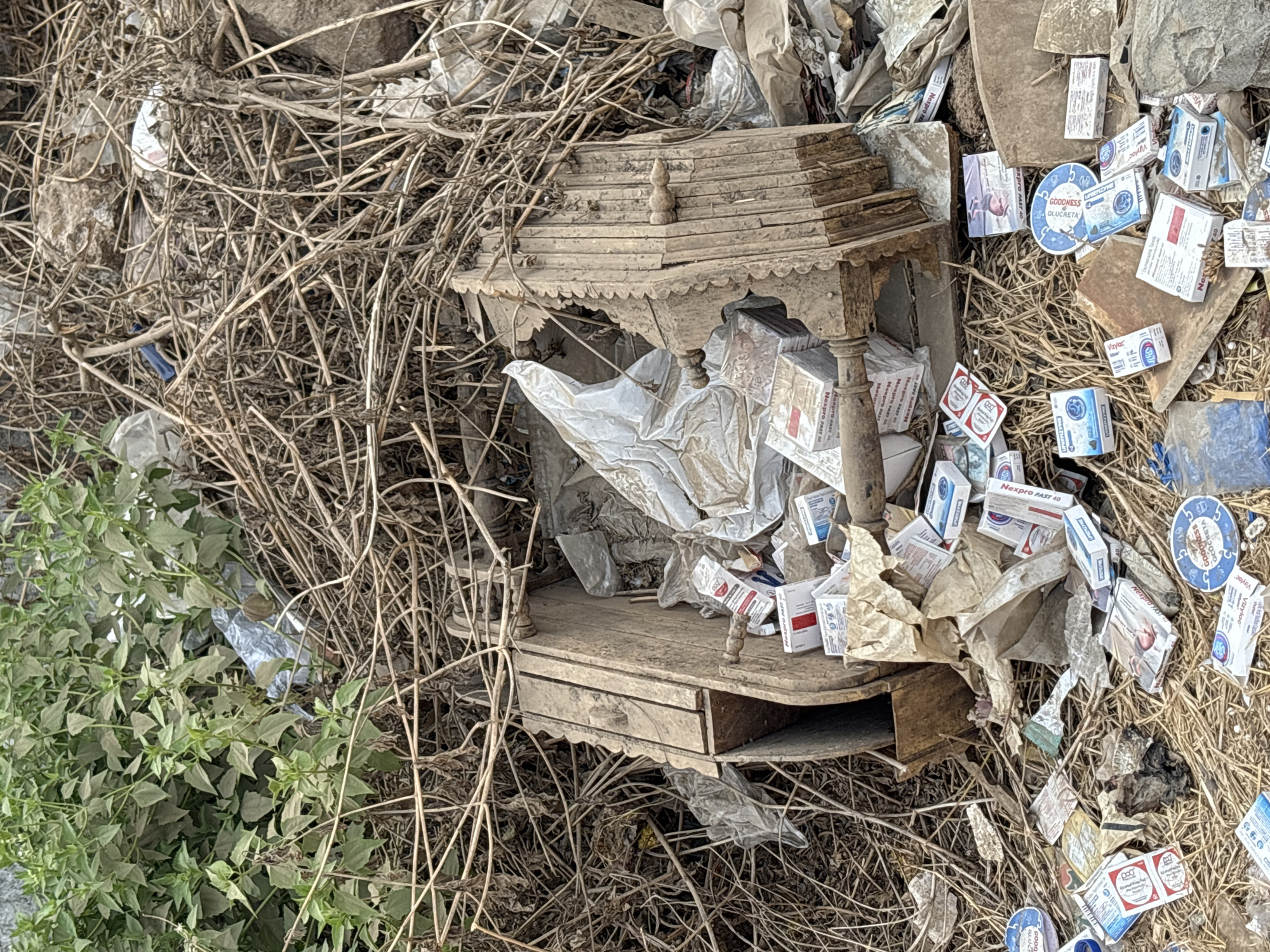 The scene depicts a discarded refuse accumulation in Ambernath, India. A large, weathered wooden structure, possibly a broken traditional farm implement or furniture component with carved details, rests horizontally in the center. Its interior and surrounding ground are filled with numerous small cardboard boxes, predominantly pharmaceutical packaging (e.g., "Nexpro FAST 40", "GOODNESS GLUCHEKTA", "Vinyac"), interspersed with crumpled plastic bags in white, grey, and blue. The ground consists of dry, tangled plant stems and exposed soil. Green, leafy vegetation grows in the upper left background, while the upper right is dominated by dense, dry, intertwined branches and detritus. No individuals or active processes are visible.