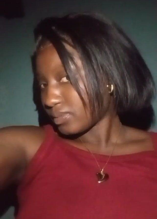 dark-skinned woman with shoulder-length black hair wearing a red tank top and a gold heart necklace. She is facing the camera and looks around, then smiles slightly. The background is a dark room with a teal wall. She has small hoop earrings and a nose ring.