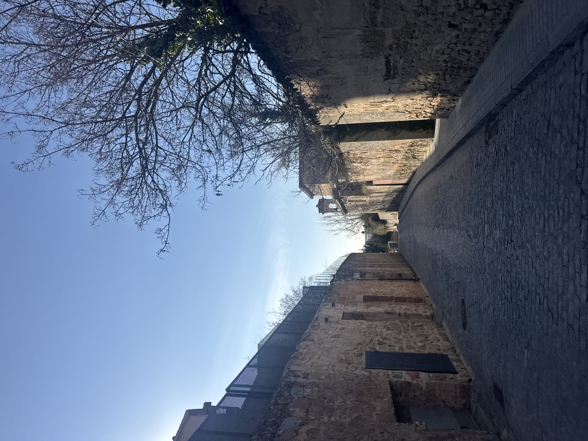 An uphill-sloping cobblestone street in Segovia, Spain, is depicted under a clear, light blue sky with a low sun casting long shadows. The street is flanked by tall, aged walls. On the left, a multi-textured stone wall, primarily brown and grey, features several recessed openings, some fitted with dark, perforated metal coverings. Above this wall, a modern dark grey metal mesh fence extends upwards. On the right, a similar stone and partially plastered wall runs parallel to the street. A narrow, elevated concrete sidewalk borders this right wall. Further along this side, a building with a small bell tower is visible, partially obscured by a large deciduous tree with bare branches and some green ivy clinging to the wall. The cobblestone street is dark grey, appearing somewhat worn, and includes a visible manhole cover and a narrow drainage channel separating it from the right-side sidewalk. The left wall and parts of the street are illuminated by direct sunlight, while the right wall and sidewalk are largely in shadow. No individuals, vehicles, or active elements are present in the scene.