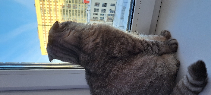 A grey tabby cat sits on a white windowsill, its back to the viewer. It looks out a window at a tall, gold-colored building across the street under a bright blue sky. The cat's tail curls up towards its body, and its paws are tucked against the white wall. The scene is bathed in natural light.