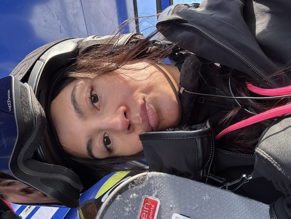 This is a close-up, high-angle portrait photograph of a female individual taken outdoors in Sankt Anton am Arlberg, Austria. The woman, with dark hair and brown eyes, is centered in the frame, directly facing the camera with a slight pout on her lips. She wears a black ski helmet, upon which a pair of dark-lensed goggles (labeled "LKO SNOW") are pushed up. She is dressed in a black outer jacket, underneath which a black fleece collar is visible. A bright pink drawstring or strap runs diagonally across her chest. A black earbud with its wire is visible in her right ear. To the left of the frame, a section of a gray ski or snowboard is visible, coated with ice crystals, featuring a red "Klein Sports" sticker. Reflections in the goggles show a blurry outdoor scene, including a portion of what appears to be a striped blue and white object, likely part of a ski lift chair. The background indicates a sunny outdoor environment with a clear blue sky visible in the upper right. The individual appears to be seated, likely on a ski lift.