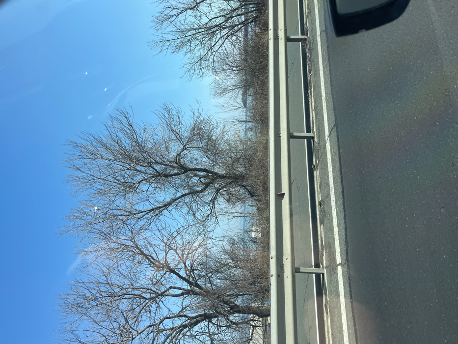 The image depicts an outdoor scene captured from a vehicle on a clear, sunny day, in the vicinity of Chernomorets, Bulgaria. The foreground shows a dark asphalt road with two parallel white solid lines marking its edge. Above the road, a silver metal guardrail, consisting of horizontal beams supported by vertical posts, extends across the mid-ground from left to right. A small, reddish-orange reflector or marker is present on the top rail of the guardrail towards the left. Behind the guardrail, a dense cluster of leafless deciduous trees and shrubs forms a natural barrier, indicative of late autumn, winter, or early spring. Beyond this vegetation, a body of water, likely the Black Sea, is visible, extending to the horizon. Distant landmasses or an island can be faintly discerned on the far side of the water, particularly towards the right. The sky overhead is a clear, bright blue with minor light reflections or lens flares visible, consistent with sunlight interacting with a vehicle's windshield or window. A portion of a dark object, possibly a vehicle's side mirror, is visible in the bottom right corner of the frame. No individuals or animals are present.