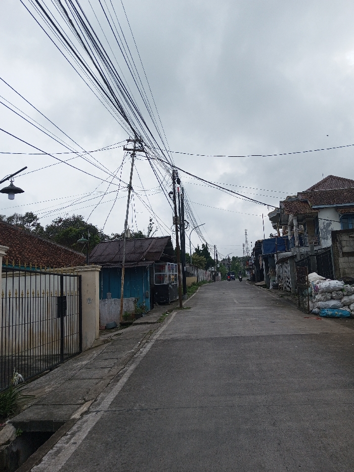 A quiet street view features an overcast sky and a straight asphalt road stretching into the distance. Electrical wires tangle overhead, connected to several utility poles. Buildings line each side, including a teal structure and a gated property. A pile of white sacks sits on the right. In the distance, two motorcycles approach along the road. The scene suggests a residential neighborhood on a cloudy day.