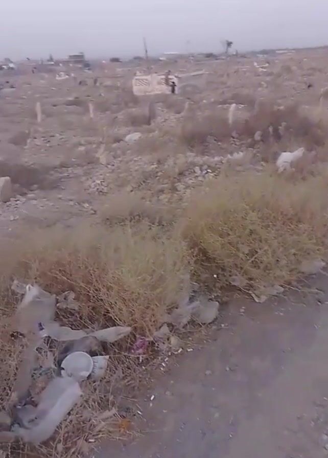 Okay, here is a concise description of the video: The video shows a desolate cemetery in a dusty, arid environment