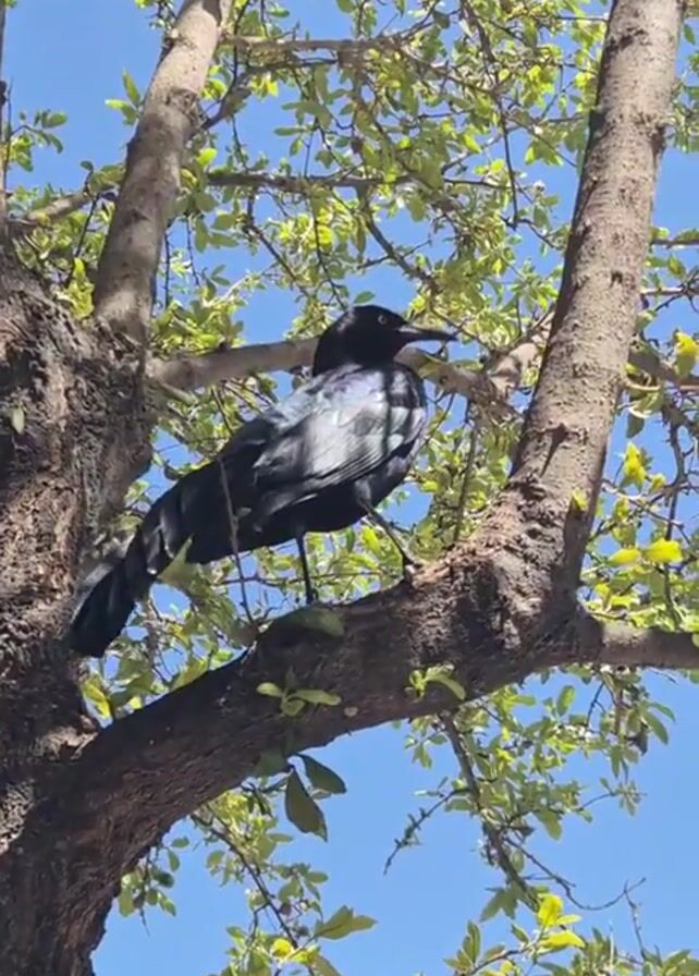 The video features a black bird perched on a tree branch against a clear blue sky. The tree is in full leaf with small green leaves. The bird is positioned near the center of the frame. The tree trunk and branches are a medium-brown color. The camera angle is low, looking up at the bird.
