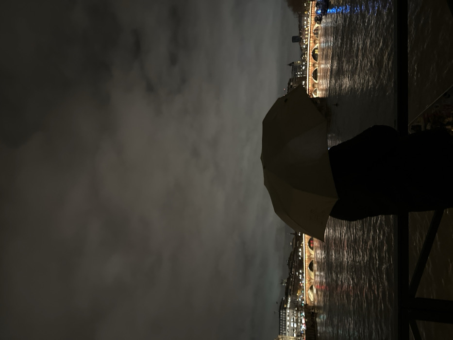 A night scene presents a cloudy sky over water reflecting bridge lights. An open umbrella, partially visible, suggests rain. A dark figure stands nearby, adding a human element. Metal railing can be seen at the right-hand side of the image. The ambiance is dark and atmospheric, with the city lights providing the only brightness.