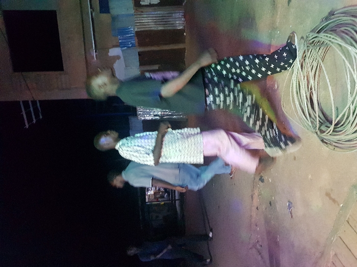 The image displays a nighttime street scene in Jos, Nigeria, featuring four male individuals on a paved surface. In the immediate foreground, a large coil of light-colored, possibly electrical or communication, cable rests on the ground. From right to left: 1. A male, appearing to be a young adult, walks from left to right, his lower body exhibiting motion blur. He wears a dark short-sleeved shirt and black trousers adorned with white asterisk-like patterns. 2. Behind him, another male, also appearing as a young adult and in motion, wears a light-colored, patterned short-sleeved shirt and light pink trousers. 3. Further back, a third male, partially obscured, walks in a similar direction, wearing a light blue or grey short-sleeved shirt and blue jeans. 4. On the far left in the background, a fourth male stands or walks slowly, facing away, dressed in dark clothing. Artificial light sources, seemingly originating from the left, illuminate the foreground and the individuals, casting shadows and producing distinct colorations, including blue and purple tones, on the ground. The background is largely dark but reveals structural elements including a building with a prominent dark rectangular window opening, corrugated metal fencing, and overhead utility lines. Scattered debris is visible on the ground.