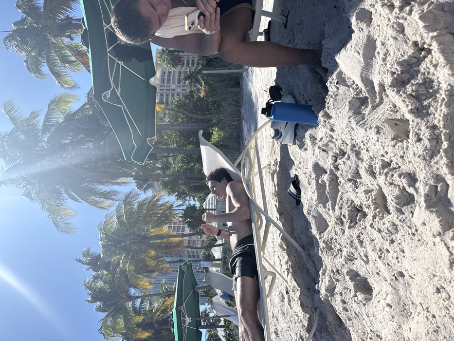 The image depicts a sunny beach scene in Key Biscayne, United States. Two young adult males are visible on a sandy beach, under a clear blue sky with prominent palm trees and multi-story buildings in the background. The individual on the left lies shirtless in dark swim trunks on a white lounge chair. His hands are raised in front of him, fingers curled as if interacting with a small object not clearly visible. A dark wristband is on his left wrist. Adjacent to his chair on the sand are a pair of black and white striped slides. The individual on the right sits on a white lounge chair, wearing dark shorts or swim trunks and a light-colored towel draped over his shoulders. He is actively engaged with a light-colored smartphone held in both hands, looking down at the screen. Between the two individuals on the sand are a bright blue water bottle and a pair of white sneakers. Green beach umbrellas provide shade overhead and further in the background. Strong sunlight creates distinct shadows on the light-colored sand.