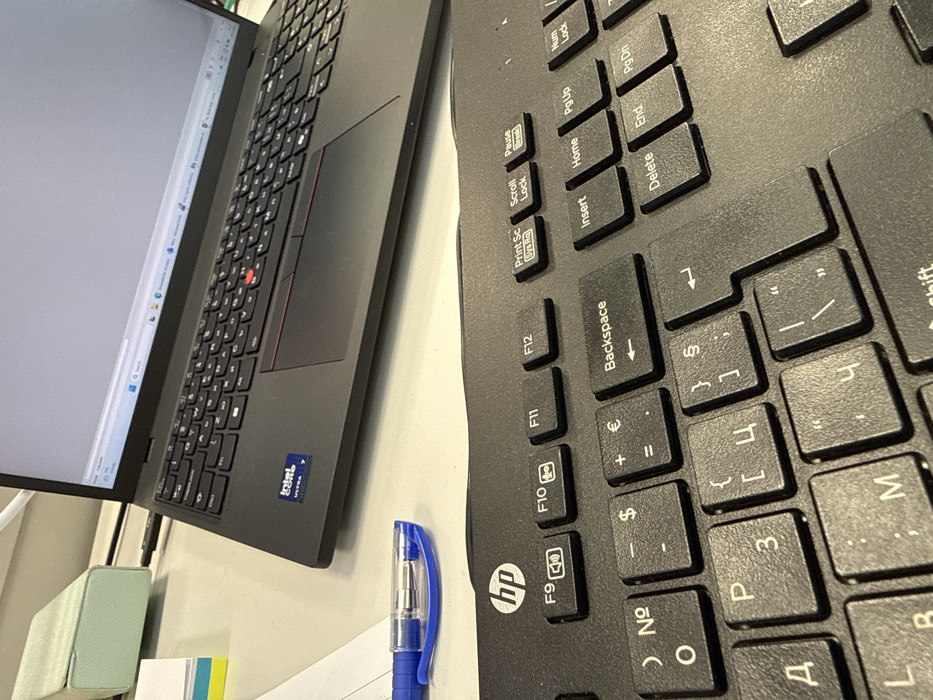 The image displays a workstation in an office setting within Karlovo, Bulgaria. A black laptop, likely a Lenovo ThinkPad based on design elements, is open on a light-colored desk. The laptop screen shows a web browser with multiple tabs open, and an "Intel Ultra 7" sticker is visible on its palm rest. A black external HP-branded keyboard with a Cyrillic layout, specifically indicating Bulgarian characters (e.g., 'Д', 'Ц', 'Ч'), is positioned in front of the laptop. A blue ballpoint pen lies on the desk between the laptop and the external keyboard. In the upper left background, a light green rectangular object and a stack of yellow and blue papers are partially visible. No individuals are present in the scene.