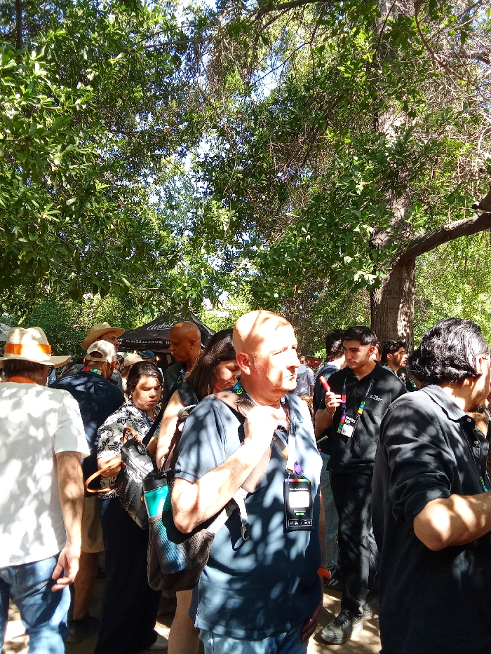 A crowd of people mill around under a canopy of green trees. Many wear lanyards around their necks. A man in a light blue shirt and backpack is in the foreground, casting a shadow. A younger man in a black shirt stands beside him, holding a similar lanyard. To the left, a woman in a patterned shirt carries a backpack and water bottle. A white tent is visible in the background, surrounded by more people.