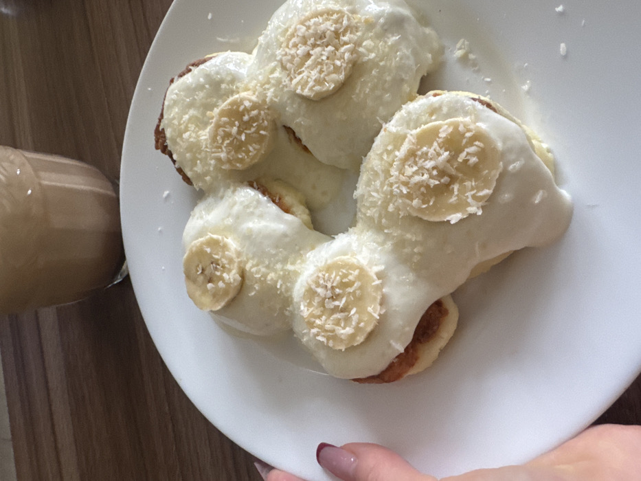 A close-up, slightly overhead view depicts a white circular plate containing five individual golden-brown, disc-shaped food items, consistent with pancakes or syrniki, arranged in an open 'C' formation on a light brown wooden surface. Each food item is generously covered with a thick, creamy white topping, garnished with a single circular slice of banana and sprinkled with shredded white coconut. A person's left hand, with manicured fingernails featuring a light base and reddish-brown tips, is visible on the lower left, positioned near the plate. In the upper right background, a clear, faceted glass tumbler containing a light brown, opaque liquid, consistent with a milky beverage, is partially visible. The scene is set on a light brown wooden tabletop with a horizontal grain. The location is Unknown, Unknown.