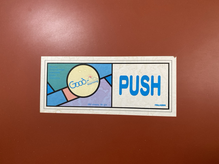 Located in Shaba, Nigeria, the image depicts a rectangular sticker or label centrally placed on a uniform reddish-brown surface. The sticker is divided into two distinct sections. The left section features a colorful, geometric design resembling stained glass, with a prominent yellow circular inset containing the blue script "Good morning" accompanied by a small sun and mountain graphic. Above this circle, faint text in a teal area lists greetings in various languages, including "Bonjour" and "Guten Morgen." Below the yellow circle, smaller black text indicates "280 sheets, 90 gsm." The right section of the sticker displays the word "PUSH" in large, bold blue capital letters, with "PALADIN" printed in smaller blue text directly beneath it. The reddish-brown background surface exhibits minor texture and faint particulate matter.