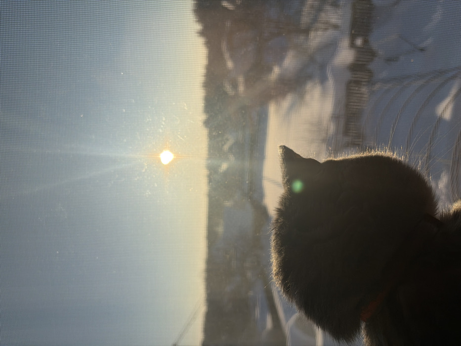 A cat silhouette, seen from behind, looks out a window towards a bright sun in a pale blue sky. Outside, snow-covered ground and blurry objects are visible. A window screen obscures the view slightly. The sun's glare creates lens flare and emphasizes the cat's outline.