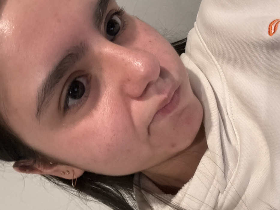 A close-up, angled shot captures a woman's face. She has fair skin, dark hair, and dark eyes, with visible freckles and a slight sheen on her forehead and nose. Her eyebrows are thick and naturally shaped. Gold earrings are visible on her left ear. She is wearing a white sweatshirt with a small orange design visible on the chest area. Her expression is somewhat pensive, with a slightly downturned mouth.