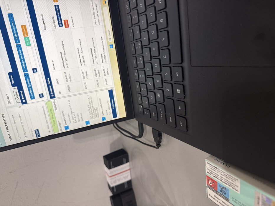 The image presents an angled, close-up view of a black laptop open on a light-colored desk. The laptop screen displays a web-based application titled "TITAN PROPERTIES," featuring Cyrillic text elements indicating a real estate or property management interface. Visible details on the screen include "Заявки" (Requests), "Филтър" (Filter), and a table with columns for "ID," "Дата" (Date), "Относно" (Regarding), and "Съдържание" (Content). Specific entries include dates like "2026-03-17" and an address: "к-с Бела Черква, бл. 5, вх. Б, ет. 2, ап. 7," identifying a residential location in Sofia, Bulgaria. Financial data, such as "750 Евро," and personal names like "Васил Петров" appear within the request details. A black USB cable is connected to the laptop's left port. In the foreground, positioned to the left of the laptop, is a pack of Kent Classic cigarettes with blue and white packaging. Behind the cigarettes, three small, black rectangular electronic devices, one wrapped with a red and white band, are arranged on the desk. The desk surface is light-colored, and the background is a plain, light-toned wall. No individuals are depicted, but the setup indicates an active workspace.