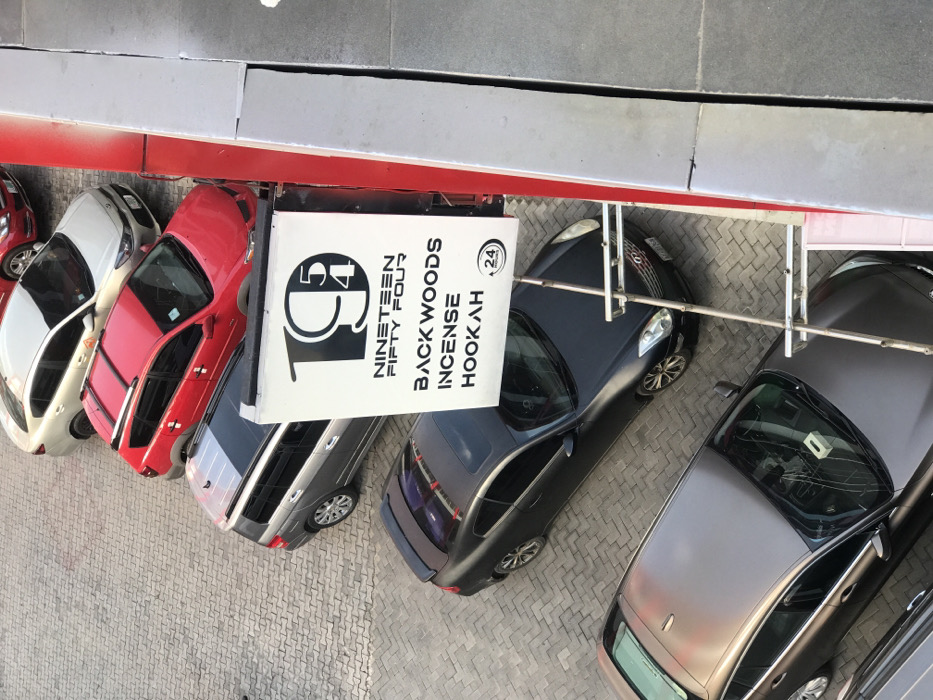 An overhead, downward-angled view captures a parking area adjacent to a commercial building in Abuja, Nigeria. A white vertical sign, mounted to a red building facade, is prominently displayed in the mid-right. The sign features "1954" in large black numerals, with smaller text reading "NINETEEN FIFTY FOUR," "BACKWOODS," "INCENSE," and "HOOKAH," alongside a "24 HOURS" emblem. The building's exterior transitions from red to a lighter grey or silver section above. The ground is paved with grey interlocking concrete pavers. Six vehicles are parked parallel to the building, facing right in the frame. These include, from top to bottom: a light-colored sedan, a red crossover/SUV, a grey SUV, a dark grey/black coupe with minor damage to its front right bumper, a dark grey sedan with a white tissue box on its dashboard, and a partial view of a sixth dark vehicle's front section. No individuals are present. The depicted establishment is the 1954 Backwoods Hookah Lounge, located at Suite 3, Adisa Plaza, Nazeef Arcade, Gwarinpa Estate, Abuja.