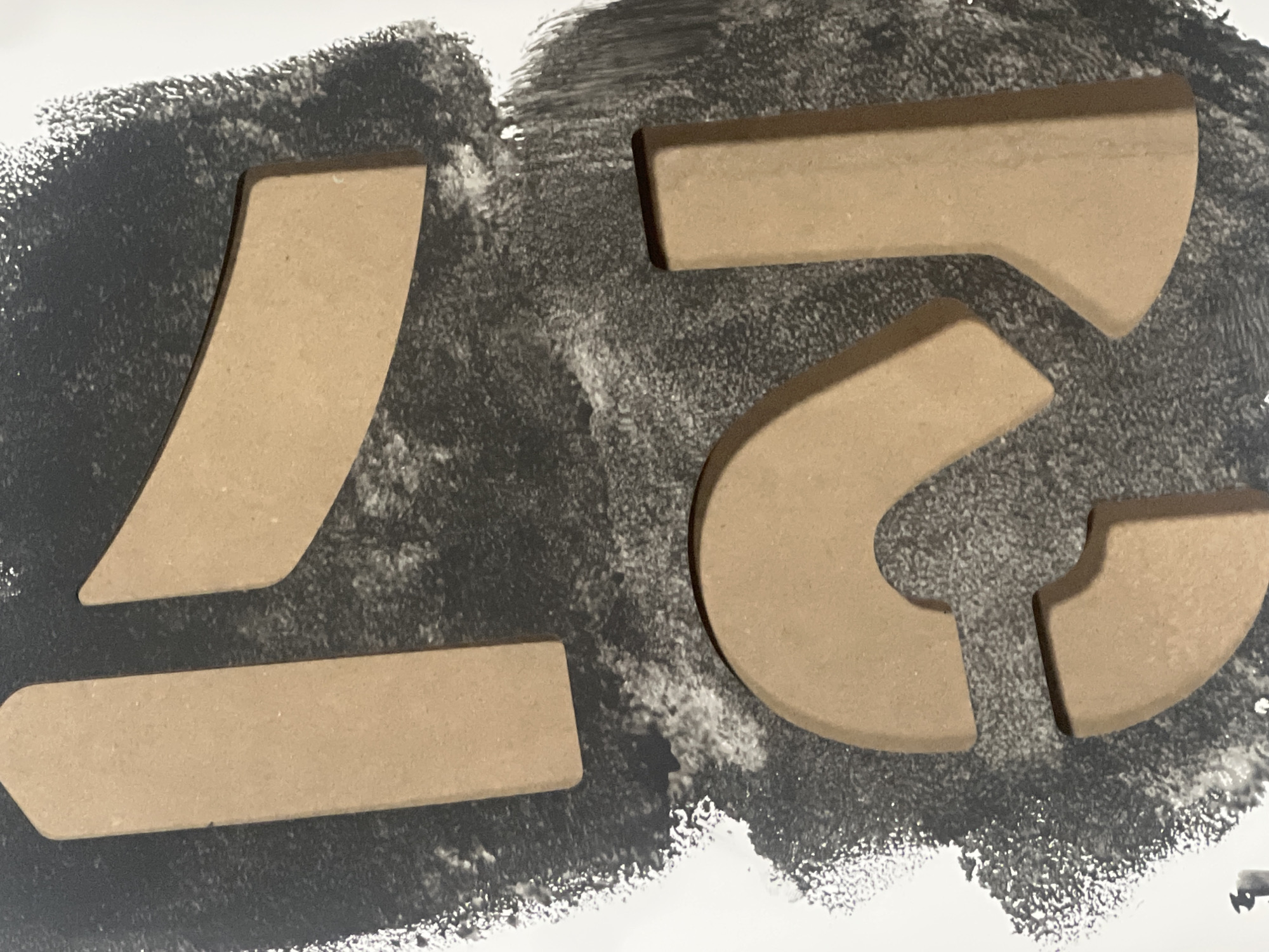 The scene, presented as occurring in Sofia, Bulgaria, depicts a close-up, overhead view of several light-brown, thick, geometric shapes acting as masks or stencils on a white background. These shapes cast subtle shadows, indicating they are raised objects. A dark grey to black textured substance, appearing to be paint or ink, has been applied unevenly across the white background, surrounding and partially overlapping the edges of the light-brown shapes. The dark substance exhibits a granular texture and visible brushstrokes or spray patterns, particularly on the right side of the frame. Specifically: - **Subjects/Objects:** Four distinct light-brown shapes are visible. The upper left shape is a vertical rectangle with a rounded top. The upper right shape is an angled, somewhat trapezoidal form. The lower left shape is a large, rounded, 'C'- or 'U'-like curve. The lower right shape features a wider, curved base tapering upwards into a vertical segment. These shapes resemble components of numbers or letters, such as '1', '2', '4', or parts of Cyrillic characters. The shapes appear to be constructed from a uniform material like MDF or thick cardstock. The white background surface is visible underneath and around the shapes. - **Actions/Interactions:** The arrangement suggests an artistic or craft process where the light-brown shapes were used to mask specific areas of the white surface during the application of the dark substance. The shapes are currently static, possibly still in place post-application or waiting to be removed. - **Environment:** The setting is a flat, undifferentiated white surface, likely indoors on a table or board. No other environmental details, people, or dynamic interactions are present. The image contains no visual elements directly identifiable with the city of Sofia, Bulgaria.