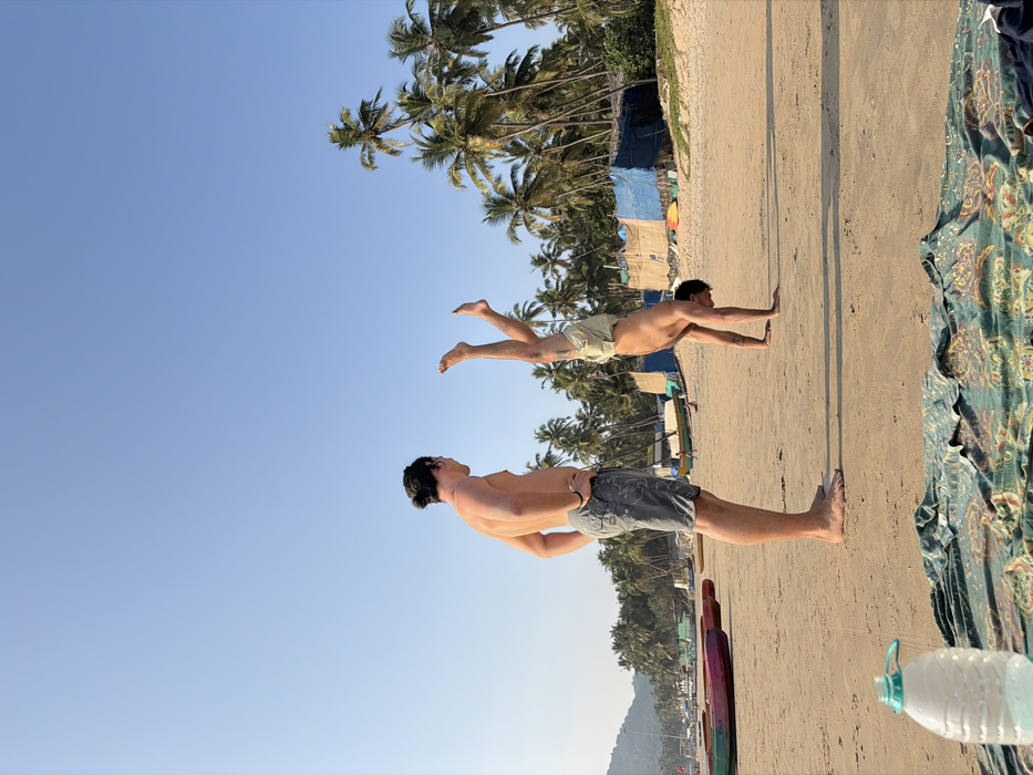 The image displays a sandy beach scene in Kolamb, India. Two adult males are visible on the beach under a clear blue sky. On the left, a shirtless male with dark hair tied in a bun, wearing grey patterned board shorts, stands facing right, observing the second male. The second male, also shirtless and wearing light-colored shorts, is performing a handstand on the sand with his legs extended upwards. In the immediate foreground, a partially filled clear plastic water bottle with a green cap rests on a green and orange patterned cloth spread on the sand. The background features a dense line of palm trees extending across the horizon. Beneath the palm trees, several small, brightly colored boats or kayaks are beached, along with multiple structures constructed with blue tarpaulin coverings. Distant hills are discernible on the far left horizon. The bright sunlight casts distinct shadows from the subjects and palm trees onto the sand.