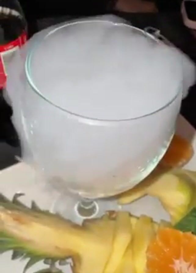 A white plate of cut-up fruit, including pineapple, orange slices, kiwi, and persimmon slices, is filmed with a large wine glass sitting in the center. The wine glass is filled with a cloud of white smoke. A Coca-Cola bottle and a box of cigarettes are in the background. Pop music plays. A voice says, “Oh shit.”