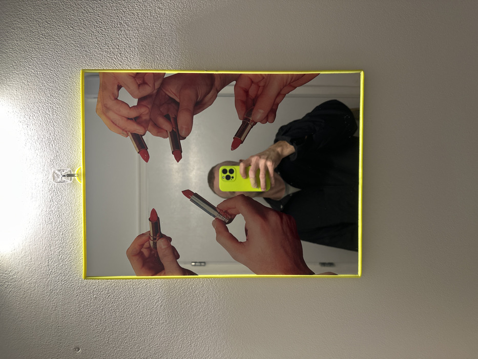 The scene depicts a selfie taken in a mirror, purportedly within a private or commercial establishment in Tel-Aviv, Israel, likely a bathroom or dressing area. A rectangular mirror with a prominent yellow LED-lit frame is mounted vertically on a light-colored, textured stucco wall. Above the mirror, a clear adhesive hook with a metal prong is visible, securing a bright overhead light source that illuminates the wall. Reflected in the mirror is a male individual, partially obscured by the device he is holding. He is wearing a dark, possibly black, collared shirt over a lighter undershirt. His head shows short, light-colored hair or stubble. His face is concealed by a neon yellow or lime green smartphone, held in his right hand, which features a triple-lens camera array on its back. The individual is actively taking the photograph. Surrounding the central reflection of the person and phone, five distinct hands, presumably belonging to the same individual due to consistent skin tone and appearance, are reflected. Each hand is holding a lipstick with the product extended. The lipsticks feature varying casings, including rose gold, brown, clear, and silver, with the product uniformly being a shade of red or pink. The hands are positioned around the edges of the mirror, suggesting a composite or multi-exposure image reflecting multiple actions. In the background of the reflection, a light-colored interior door or wall is faintly visible.