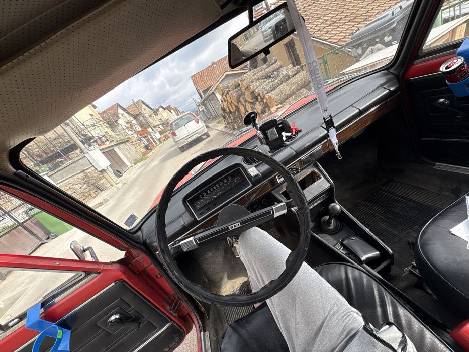 The image captures an interior view from the driver's seat of a red Lada vehicle, looking out onto a street in Iskrets, Bulgaria
