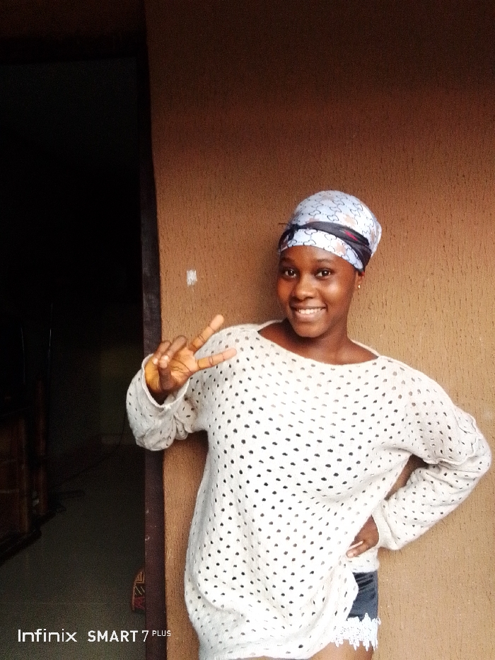 A young woman smiles, giving a peace sign. She wears a white, hole-patterned sweater and a headscarf with a patterned edge. Her left hand rests on her hip. She stands in a doorway, with a dark, shadowed space to her left. A brown wall is visible behind her. The bottom of the image displays the text "Infinix SMART 7 PLUS".