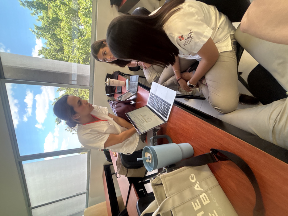 Three women are studying in a bright room, presumably a classroom, with a large window showing a blue sky and green trees. Two laptops are open on the desk, and there's also a water bottle and a tote bag visible. The women are wearing light-colored clothing and seem focused on their work. One woman's shirt has a logo with the word "Anáhuac".
