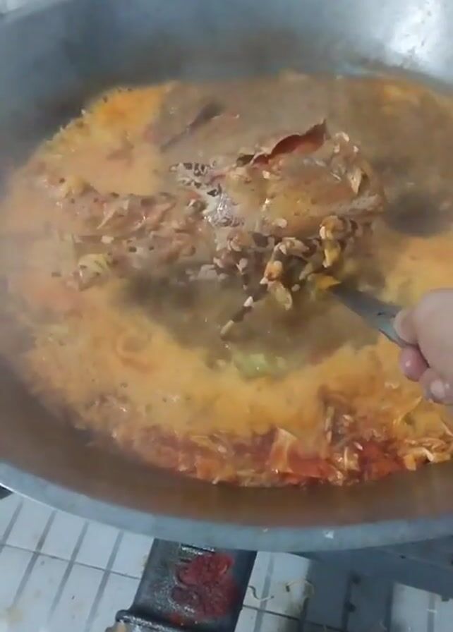close-up shot of a large, silver wok-like pan on a gas stove. Inside, a bubbling orange-yellow liquid is simmering. The contents appear to be a seafood-based stew or soup, with pieces of what seems to be lobster being stirred with a metal spatula. Steam is rising from the hot liquid. The stove is an older model with a visible gas regulator. The background shows a white tiled wall and floor. The overall impression is of a cooking process in progress, likely in a commercial or large-scale cooking environment.