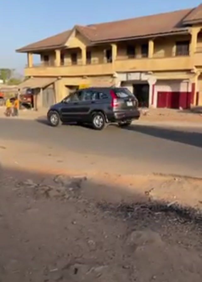 street scene in an unnamed location on a sunny day. The road is paved but appears rough and somewhat dusty. A two-story, light-colored building with a brown roof stands along the road; storefronts are visible on the ground level. Various vehicles travel on the road. A dark-colored SUV passes first, followed by a motorized tricycle and a motorcycle. Pedestrians are visible in the background. The video is taken from a stationary position, with the focus remaining on the vehicles moving down the road.