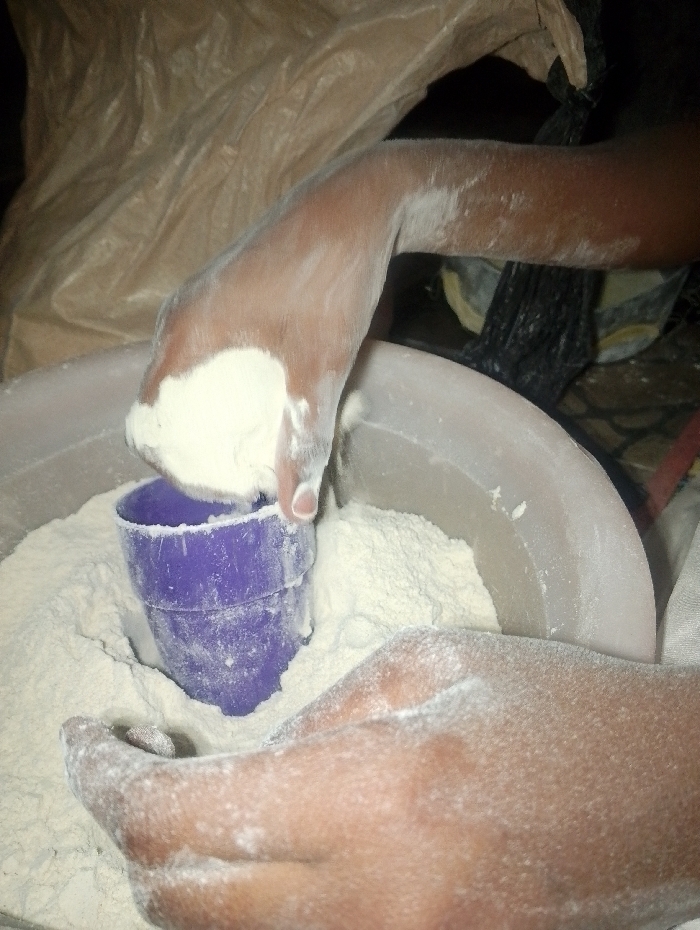 A close-up shot shows two hands covered in white powder scooping powder into a purple plastic cup inside a bowl full of the same powder. The bowl is light gray. A brown sack sits in the background. The focus is sharp on the hands and cup. The lighting is dim.