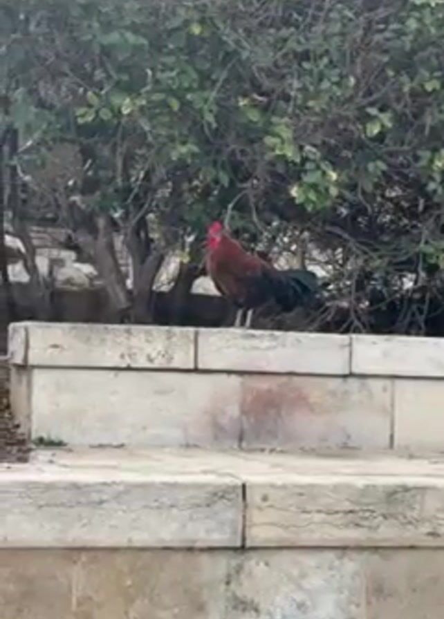 rooster standing on a low, stone wall in front of a bushy tree. The rooster is mostly brown and red with a black tail. It crows loudly. Another rooster is visible in the background to the left, partially obscured by the wall. The wall appears to be made of stacked stone blocks.