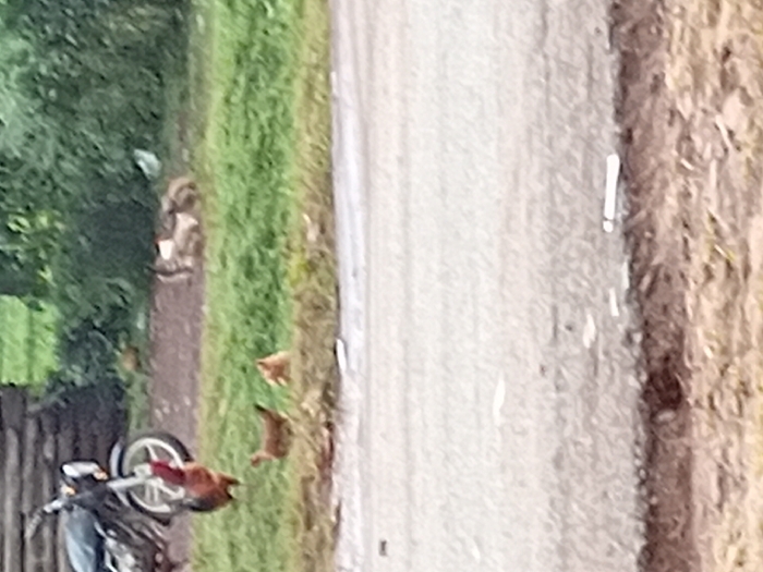 This image depicts an outdoor scene in Idakho Central ward, Kenya, characterized by a grey asphalt road, green vegetation, and several domestic animals. In the foreground, a grey asphalt road surface is visible, showing some lighter marks or debris. Immediately beyond the road is a narrow dirt and gravel shoulder, followed by a strip of green grass. On this green grass, a brown and reddish rooster stands prominently on the left side. To its right, two smaller, light-brown chickens are present on the grass. Further back, on a patch of bare brown earth, multiple light-colored, undefined small domestic animals (consistent with chickens or similar fowl) are visible, appearing to be resting or foraging. In the background on the left, a silver and black motorcycle is partially visible, parked on a dirt surface behind a dark wooden structure. To the right, the background consists of dense green foliage or bushes. No human figures are present. The scene is illuminated by ambient light.