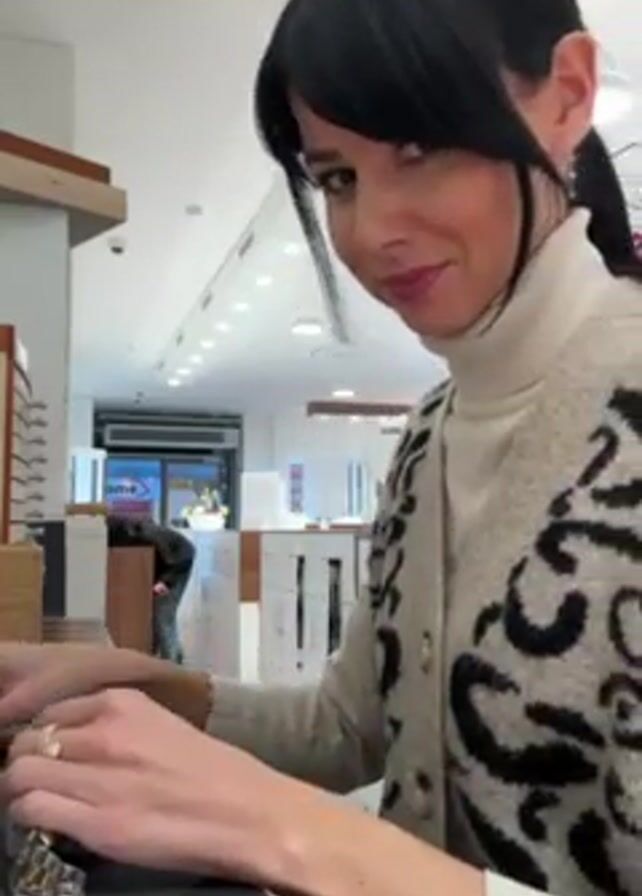 A woman with dark hair pulled back into a ponytail and wearing a white turtleneck and a beige cardigan with black animal print is shown in a mid-shot. She is standing behind a counter in what appears to be an optical shop. She is working on something using a small hammer. The shop is well-lit, and other individuals can be seen in the background. She glances at the camera several times while working.