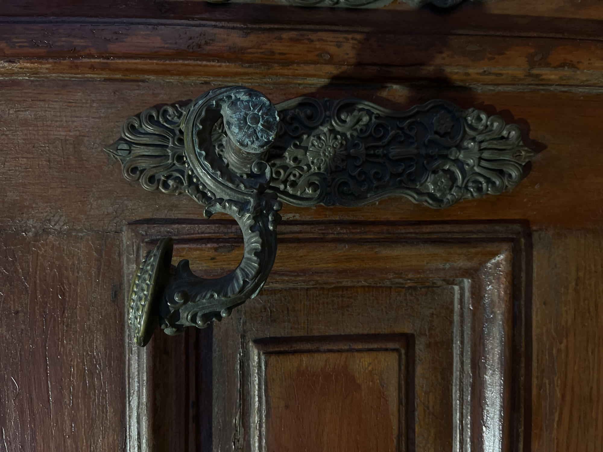 n ornate, aged door handle and escutcheon mounted on a wooden door
