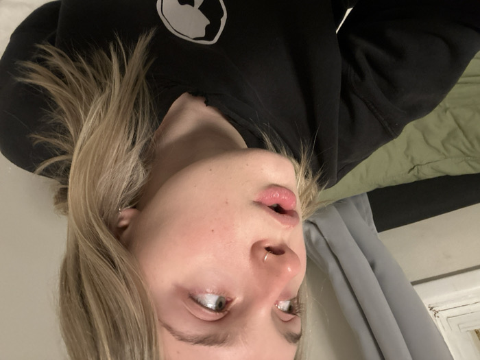 A young woman lies on her side, partially facing the camera. She has light blonde hair, fair skin, and a silver nose ring. She wears a black sweatshirt with a white emblem on the upper chest. Behind her, a gray curtain and a folded green blanket are visible. The angle is slightly off-kilter, with the background appearing behind her head. The room is simple, with white walls showing minimal detail.
