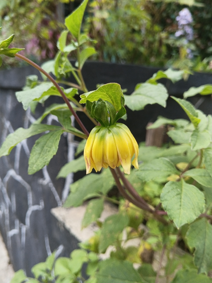 A yellow flower bud, partially opened and oriented downwards, is centered in the image. Its petals are tightly clustered, exhibiting a bright yellow color with faint reddish-brown accents along some edges, enclosed by green sepals. The bud is attached to a reddish-brown stem, from which multiple green leaves extend. The immediate background to the left features a dark gray wall with white, abstract, angular markings. To the right and further back, out-of-focus green foliage and a faint cluster of purple flowers are visible, alongside a dark, indistinct container. The scene is an outdoor garden or plant area located in the city of Unknown, Vietnam. No individuals, animals, or specific actions are depicted.