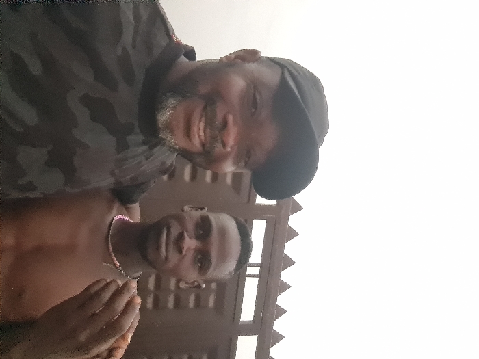 Two men pose outdoors. The upper figure, presumably older, wears a camouflage shirt and a dark baseball cap, smiling slightly with a gray beard. The lower figure is bare-chested, with a pink beaded necklace. A brown fence with peaked tops is visible behind them. The sky is overcast, providing diffused lighting for the scene.