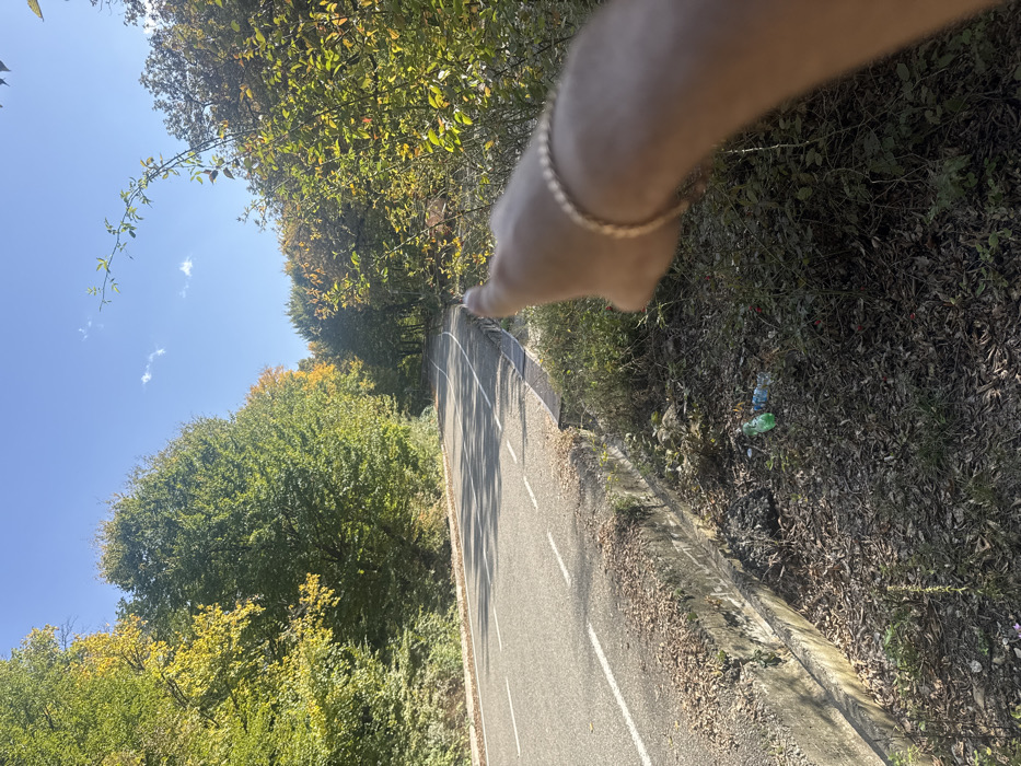 The image displays a two-lane asphalt road curving through a dense deciduous forest under a clear blue sky in Telavi, Georgia. The road features a broken white center line and solid white edge markings. On the immediate right, a concrete curb separates the road from a lower embankment covered in dry leaves, sparse vegetation, and two discarded plastic bottles (one green, one clear). A human arm, adorned with a gold-colored link bracelet, extends from the lower right foreground, pointing horizontally towards the distant curve of the road. Both sides of the road are flanked by mature trees exhibiting predominantly green and some yellow autumnal foliage. Scattered white clouds are visible in the upper sky. The scene is illuminated by direct sunlight, casting visible shadows.