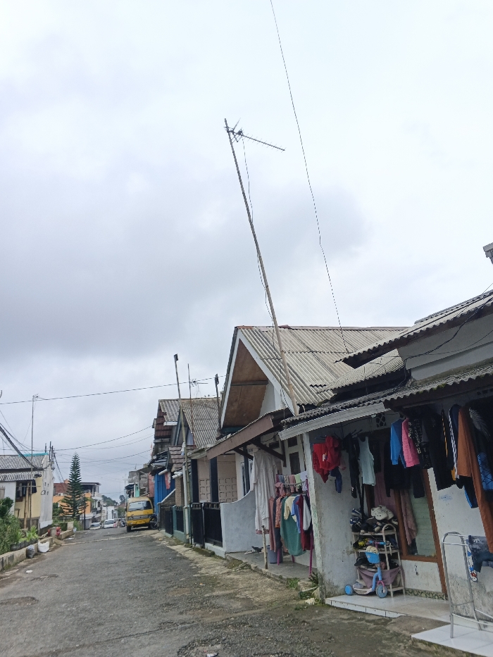 The image presents a residential street in Kabiufa, Papua New Guinea, under an overcast sky. The asphalt road, showing signs of wear, leads uphill from the foreground. Buildings, primarily single-story structures with corrugated metal roofs and painted facades, line both sides of the street. On the immediate right, a house features an outdoor area where various items of clothing, including shirts, pants, and dresses of multiple colors, are suspended on drying racks and lines. Adjacent to this, a multi-tiered shoe rack holds several pairs of footwear, and a blue child's scooter is positioned on the ground. A tall, slender pole extends vertically from this structure, supporting a television antenna with visible lead-in wires. Utility lines are strung across the street between poles. Further down the street on the left, a yellow box truck or mini-bus is parked. A small, conical evergreen tree is visible in the mid-ground on the left. No individuals are present in the scene.