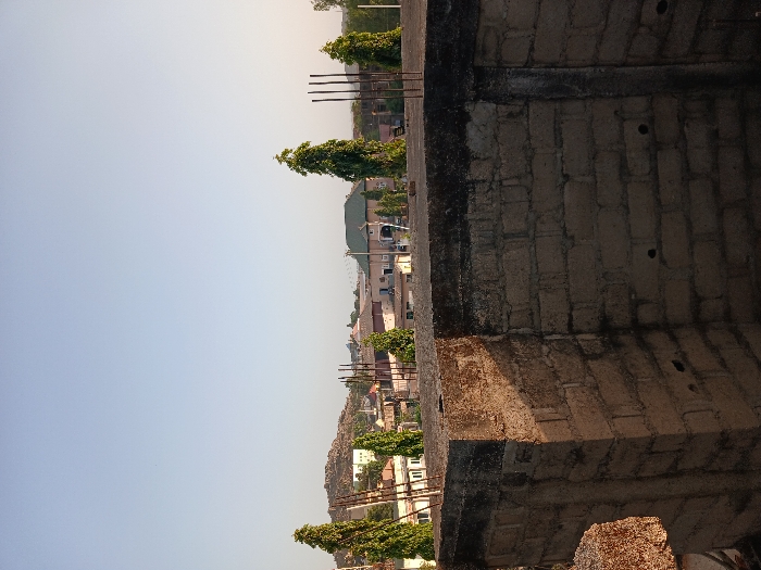An unfinished structure, likely concrete block, dominates the right side. Its surface is aged and stained. A cityscape is partially visible through exposed rebar at the top, including buildings and trees. A vast expanse of pale blue sky stretches to the left. The image has been rotated to make the sky appear as if it is to the left of the buildings.