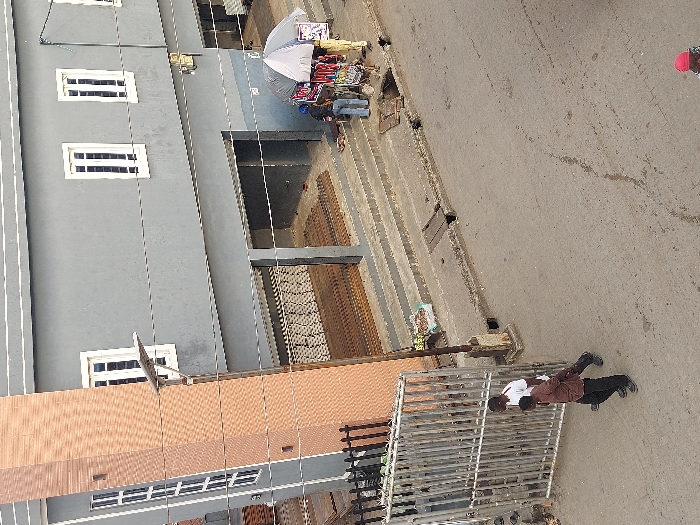 A street scene from an elevated angle captures a multi-story building with gray and orange exterior walls. Windows line the building's facade. A makeshift vendor stand with an umbrella is situated on the sidewalk next to the building. Two men dressed in a white shirt and a brown shirt stand near a metal gate. The street stretches away from the building, its surface visible, but the overall scene has a slightly rotated orientation.