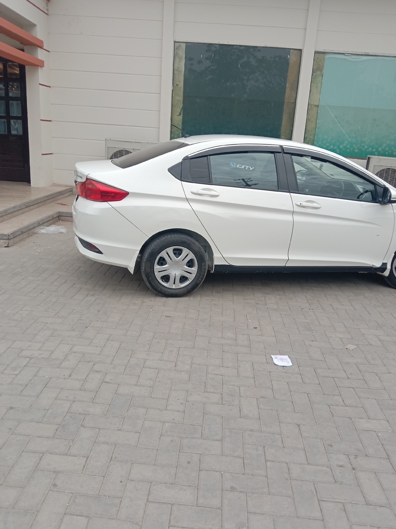 A white Honda City sedan, identifiable by "CITY" branding on its rear passenger window, is parked on a grey interlocking paver surface, viewed from its rear driver's side