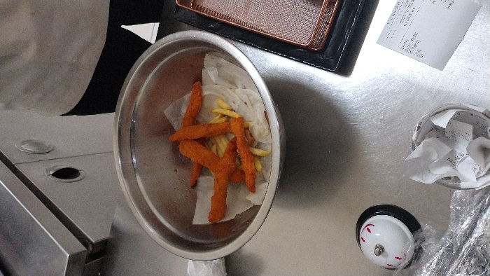 The image depicts a close-up, overhead view within a professional kitchen or food preparation area at "Морски Капан" (Morski Kapan), located on Knyaz Boris I Street No. 24 in Varna, Bulgaria. The central focus is a silver-colored metal bowl situated on a brushed stainless steel countertop. Inside the bowl, a piece of crumpled white parchment paper serves as a liner, holding six breaded, orange-brown elongated food items, likely chicken strips or fish fingers, intermixed with a small portion of yellow French fries. To the lower left of the bowl, a white and black counter bell with red crescent markings on its top is visible, partially obscured by clear plastic wrap. Adjacent to the bell, a crumpled white paper napkin rests on the counter. Below the main food bowl, a small metal cup or ramekin is filled with numerous crumpled white paper receipts. In the bottom right corner of the frame, a flat white receipt is partially visible, confirming the establishment's name, "МОРСКИ КАПАН," and address, "гр. ВАРНА, ул. "КНЯЗ БОРИС I" №24." To the right of the food bowl, a dark rectangular serving tray with a copper-colored mesh insert is present. In the upper left background, part of a large stainless steel appliance or structure is visible, featuring two circular cutouts or fixtures. The upper right background shows the lower torso of an individual, likely a kitchen staff member, wearing a light-colored top and a dark lower garment or apron. The scene is brightly illuminated, with reflections on the metal surfaces.