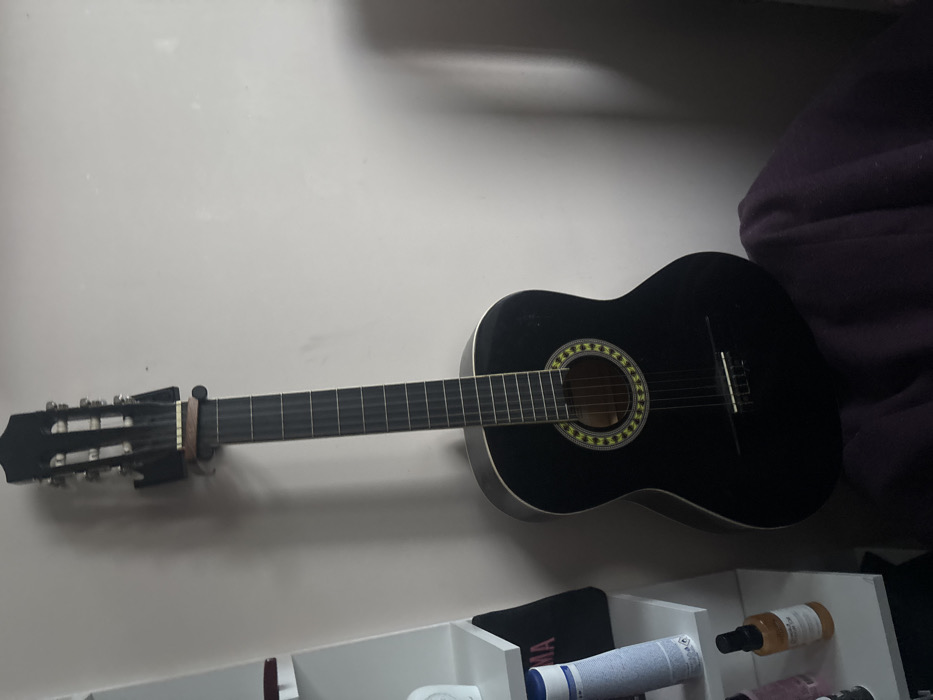 An indoor scene depicts a black classical acoustic guitar standing upright, leaning against a light-colored wall