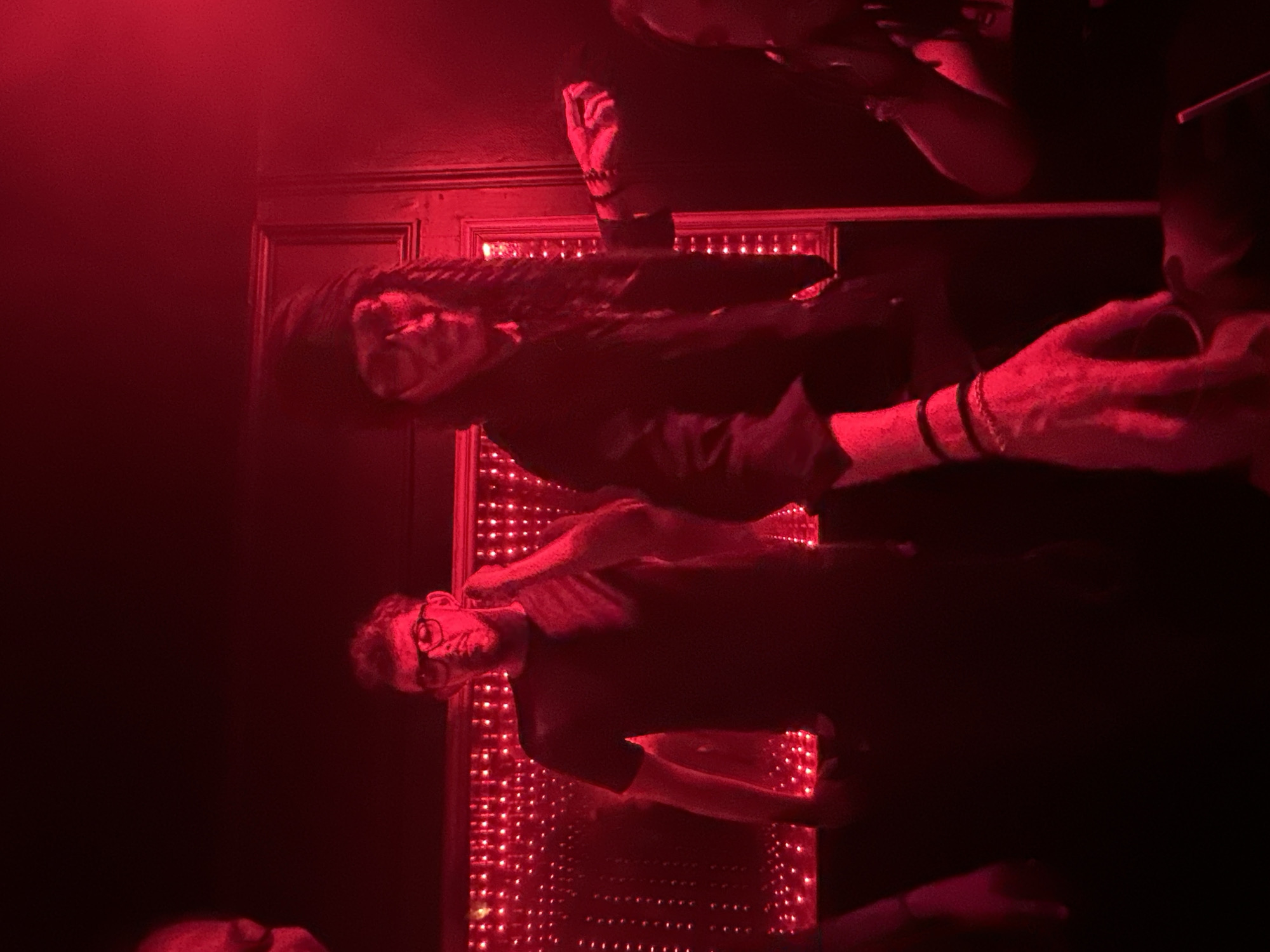A red-lit interior photograph appears to be taken in a nightclub or bar