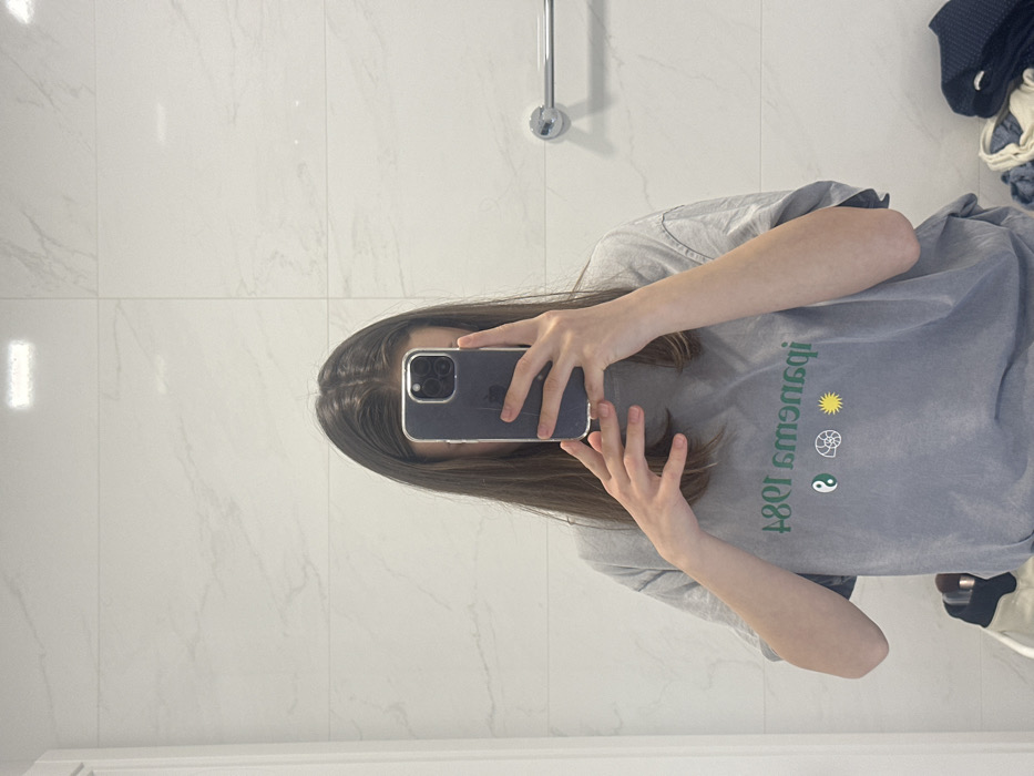 This image depicts an indoor mirror selfie taken by an individual in Ericeira, Portugal. The person, with long, dark hair, is shown from approximately the chest up, their face obscured by a dark-colored smartphone, likely an iPhone 15 Pro, which they hold with their right hand. The phone is enclosed in a clear protective case. The individual is wearing a light gray, short-sleeved t-shirt with a faded texture. The shirt displays inverted green text "Ipanema 1980" followed by three graphic symbols: a black and white Yin-Yang, a white conch shell, and a yellow sun. The person's left hand is also visible, positioned near the chest with fingers slightly splayed. The background consists of white ceramic or marble-effect tiles with faint gray veining. A white door frame is visible on the far left. On the right, a silver-toned horizontal towel rail is mounted on the wall. The floor in the lower right shows dark blue and light-colored fabrics, and partial white shoes with dark accents are visible in the lower left. Overhead lighting is reflected in the wall tiles.