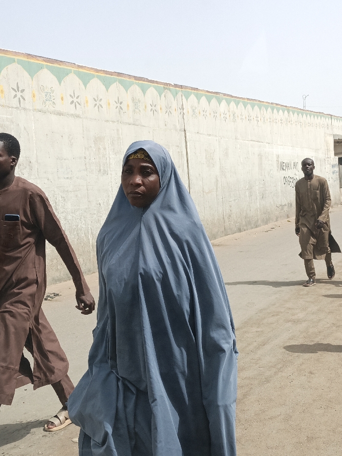 A daylight scene in Fagge C, Nigeria, depicts three individuals walking on an unpaved, light brown dirt path alongside a light grey concrete wall